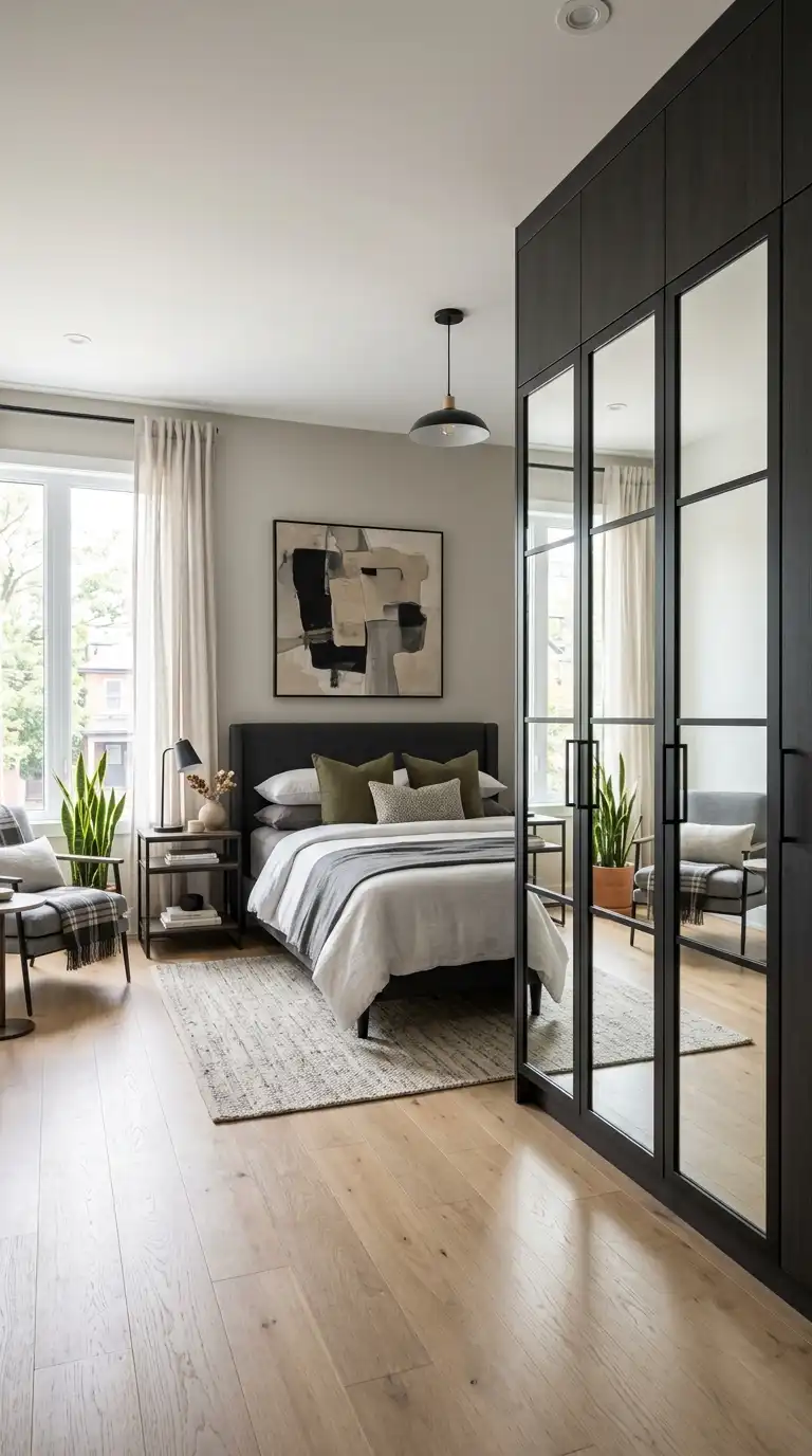 Add architectural detail to your mirrored wardrobe with framed doors. Choose frames in wood, metal, or painted finishes to complement your bedroom decor. A slim black frame adds a modern edge, while a thicker wood frame brings warmth and traditional charm.