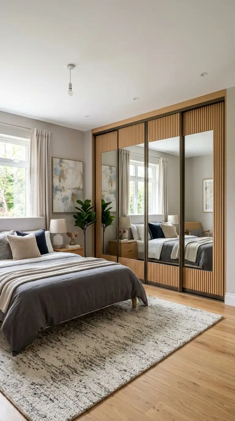 Frame your mirrored wardrobe doors with fluted or textured panels for added visual interest. The combination of smooth mirror and textured frame creates depth and contrast. This design works beautifully in contemporary and eclectic bedrooms.