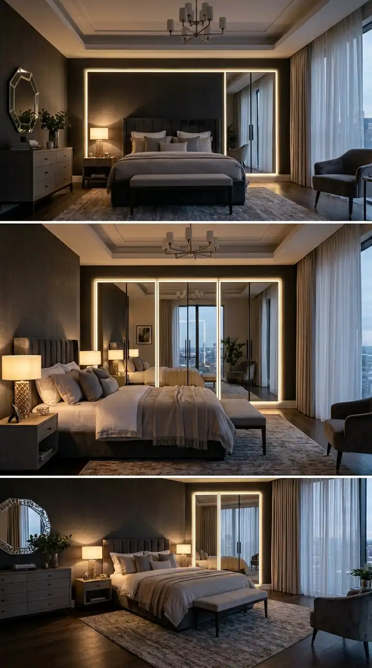Add drama and sophistication with a backlit mirrored wardrobe. Install LED strips behind the mirror panels to create a soft, halo-like glow. The backlighting adds ambiance to the bedroom and makes the mirror a striking design feature, especially in evening settings.
