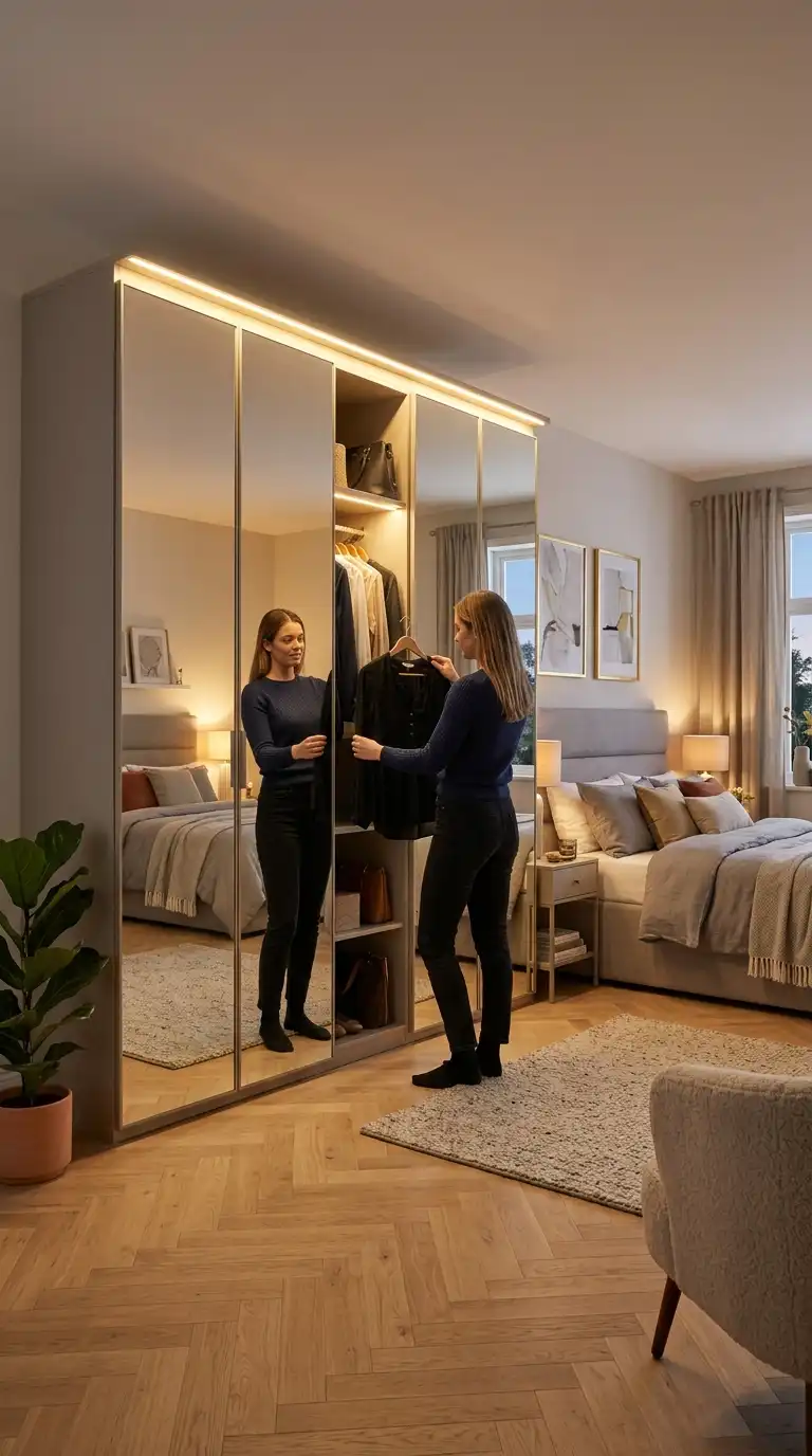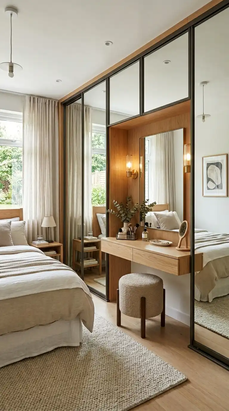 Combine a mirrored wardrobe with an integrated vanity for a complete dressing and grooming station. Position the vanity in front of the mirrored section, or use the mirror as the backdrop for a floating table surface. This setup streamlines your morning routine.