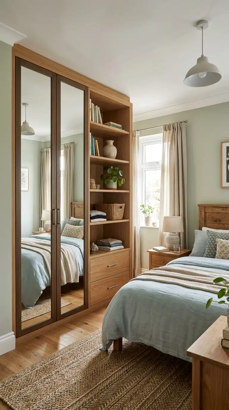Combine mirrored doors with open shelving for a balanced storage solution. Use the mirrored section for hanging clothes and outfit checks, and the open shelving for displaying accessories, bags, or folded items. This design adds variety and visual interest.