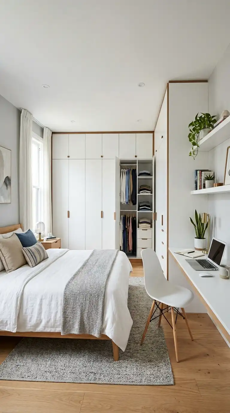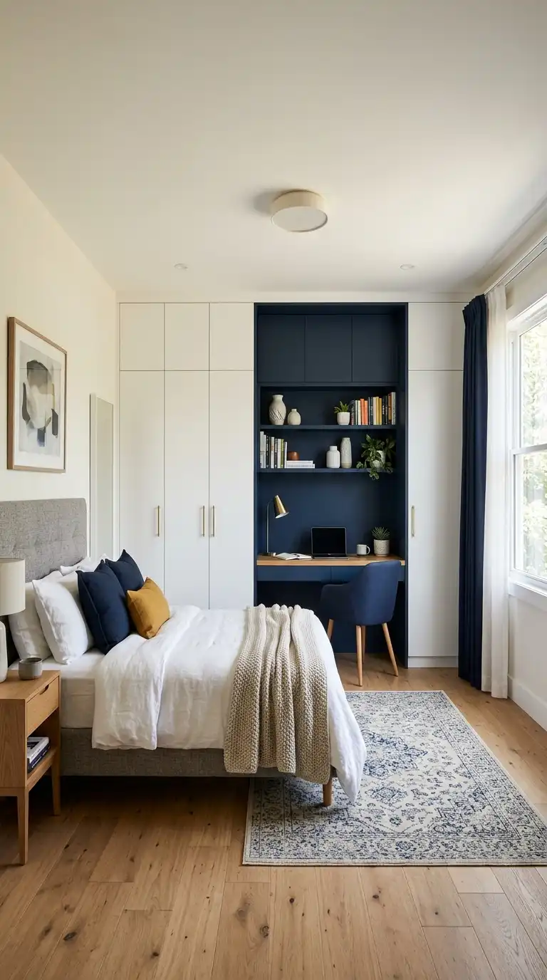 Utilize a corner of the room for a desk, with wraparound wardrobes on either side. The corner desk creates a defined workspace without disrupting the flow of the room. Use the surrounding wardrobes for clothing and storage, and the desk area for studying or working.