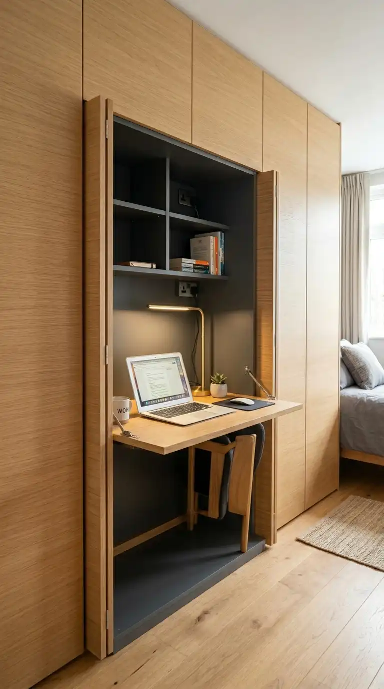 Choose a fold-down or pull-out desk that can be concealed when not in use. Position the desk in a corner or below a window to maximize space. Use the desk area for dual purposes, such as a vanity or nightstand.