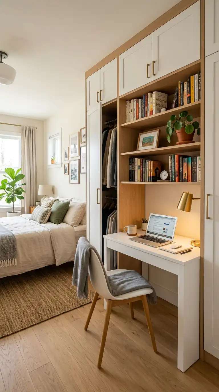 For multifunctional spaces, integrate a desk into a wardrobe system that also includes a Murphy bed. The desk can be used during the day, and the bed folds down from the wardrobe for sleeping. This is an ideal solution for guest rooms, studios, and small apartments.