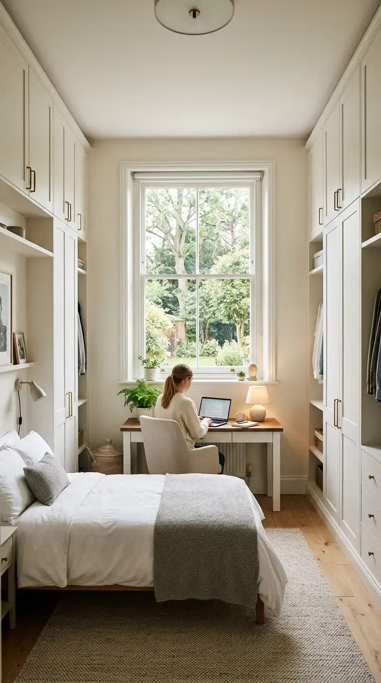 Position the desk below a window to take advantage of natural light, with wardrobes on either side. This layout creates a bright, inviting workspace while keeping storage close at hand. The natural light is ideal for studying and working, and the side wardrobes provide balanced symmetry.