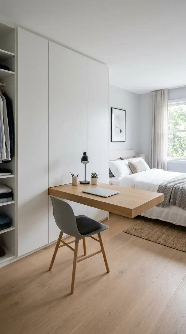 Create a modern, minimalist look with a floating desk surface that appears to have no visible supports. The desk extends from the wardrobe cabinetry, with brackets concealed beneath. This design adds a sense of lightness and is ideal for contemporary and Scandinavian interiors.