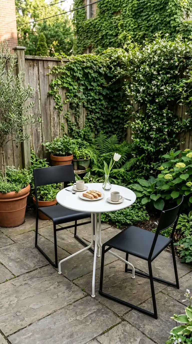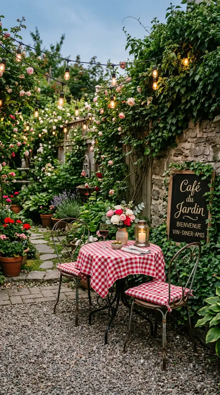 Create a romantic, Parisian-inspired bistro corner with a small round table and two vintage chairs. Use a checkered tablecloth, a small vase of fresh flowers, and a candle lantern. Hang string lights overhead, and add a chalkboard sign listing the day’s specials. This simple setup is perfect for morning coffee or intimate evening conversations.