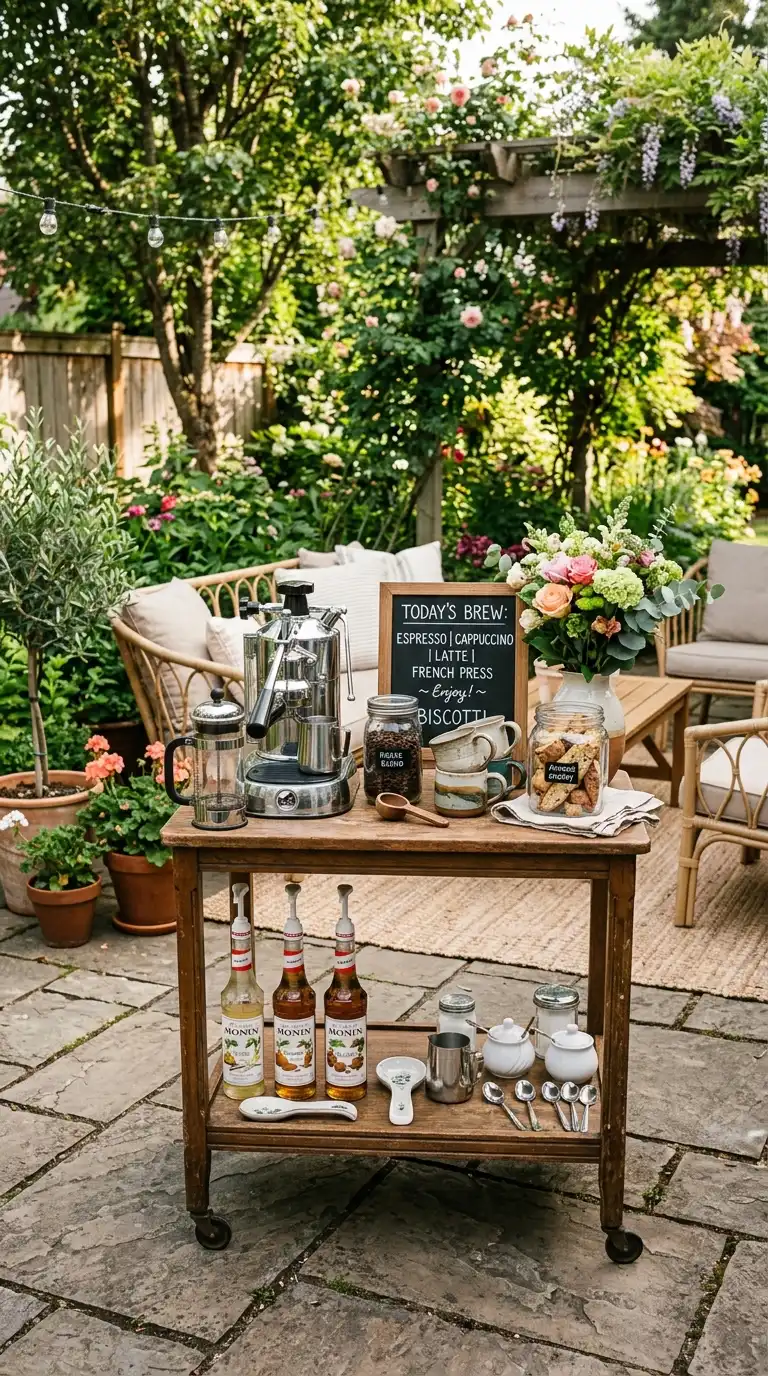 A portable coffee bar cart lets you move your cafe anywhere in the yard. Stock it with an espresso machine, French press, coffee beans, mugs, and syrups. Add a small chalkboard menu, fresh flowers, and a jar of biscotti. Use the cart for morning coffee service, afternoon pick-me-ups, or evening after-dinner drinks.