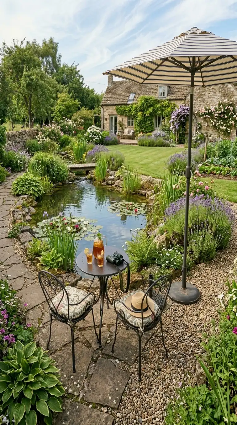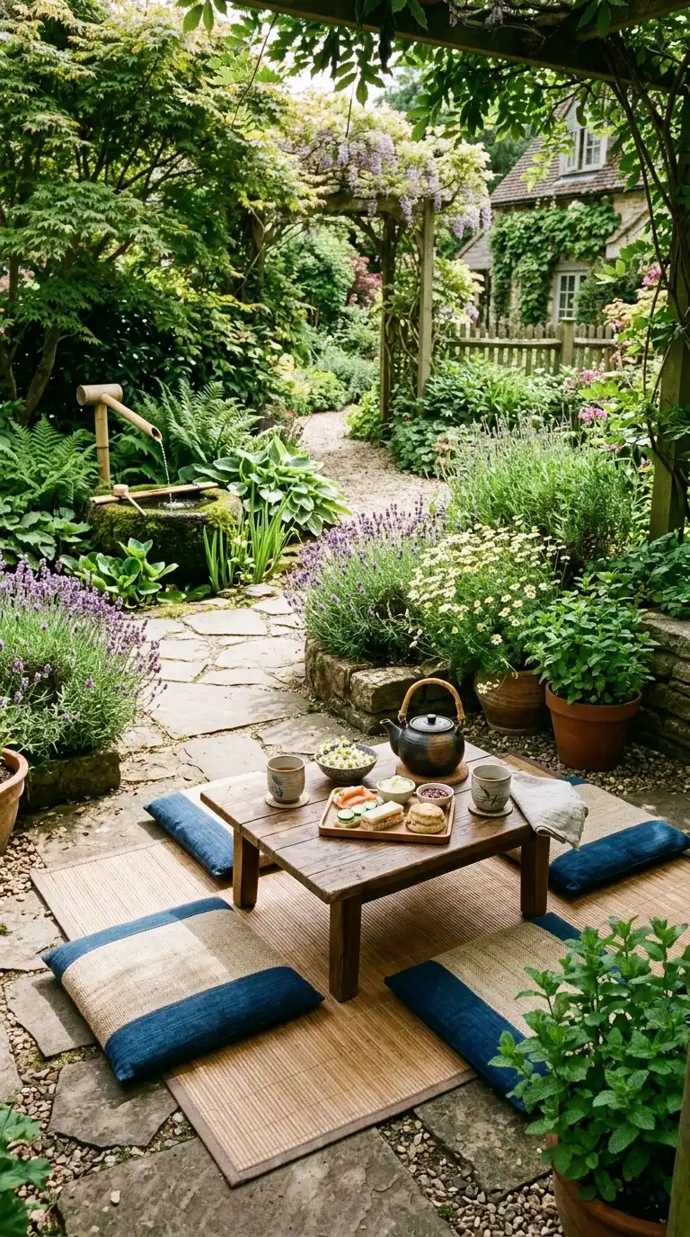 Create a serene tea garden with a low wooden table and floor cushions or a small bench. Use a ceramic teapot, delicate cups, and a tray of finger sandwiches and scones. Plant calming herbs like chamomile, mint, and lavender nearby. Add a small water feature or wind chimes for ambiance. This nook is perfect for afternoon tea or quiet reading.