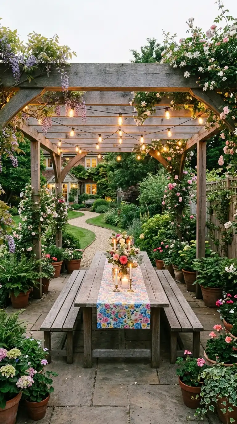 Build a pergola to define your outdoor dining area. Hang string lights or lanterns from the beams, and add a large farm table with benches or chairs. Use outdoor tablecloths, fresh flowers, and candles. The pergola provides shade and a sense of enclosure, making your backyard feel like a destination restaurant.