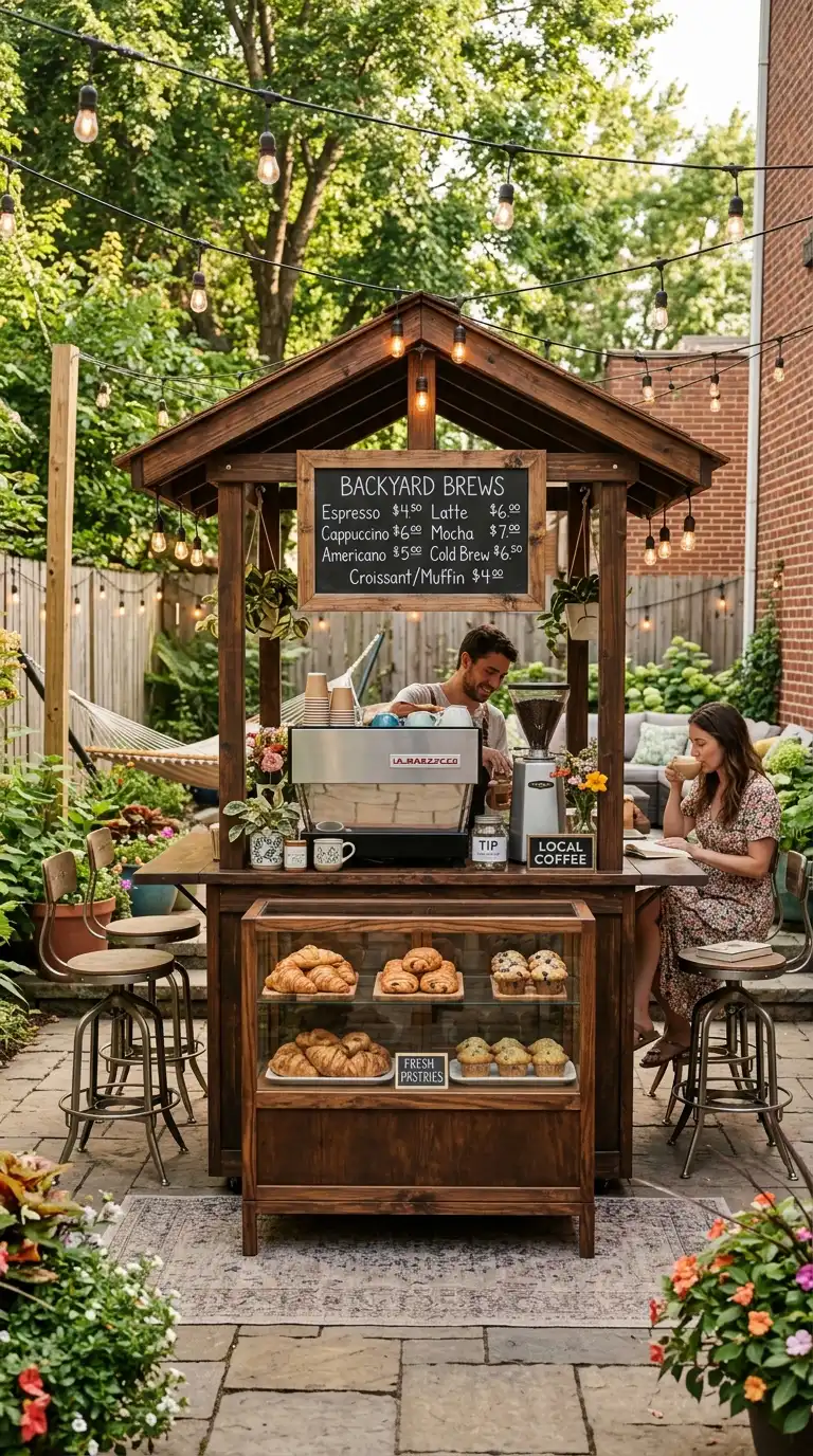 Build a small wooden stand or cart dedicated to espresso and pastries. Use a professional espresso machine, grinder, and a display case for croissants, muffins, and biscotti. Add a small seating area with two stools at a narrow counter. This setup is perfect for morning service or weekend brunch.