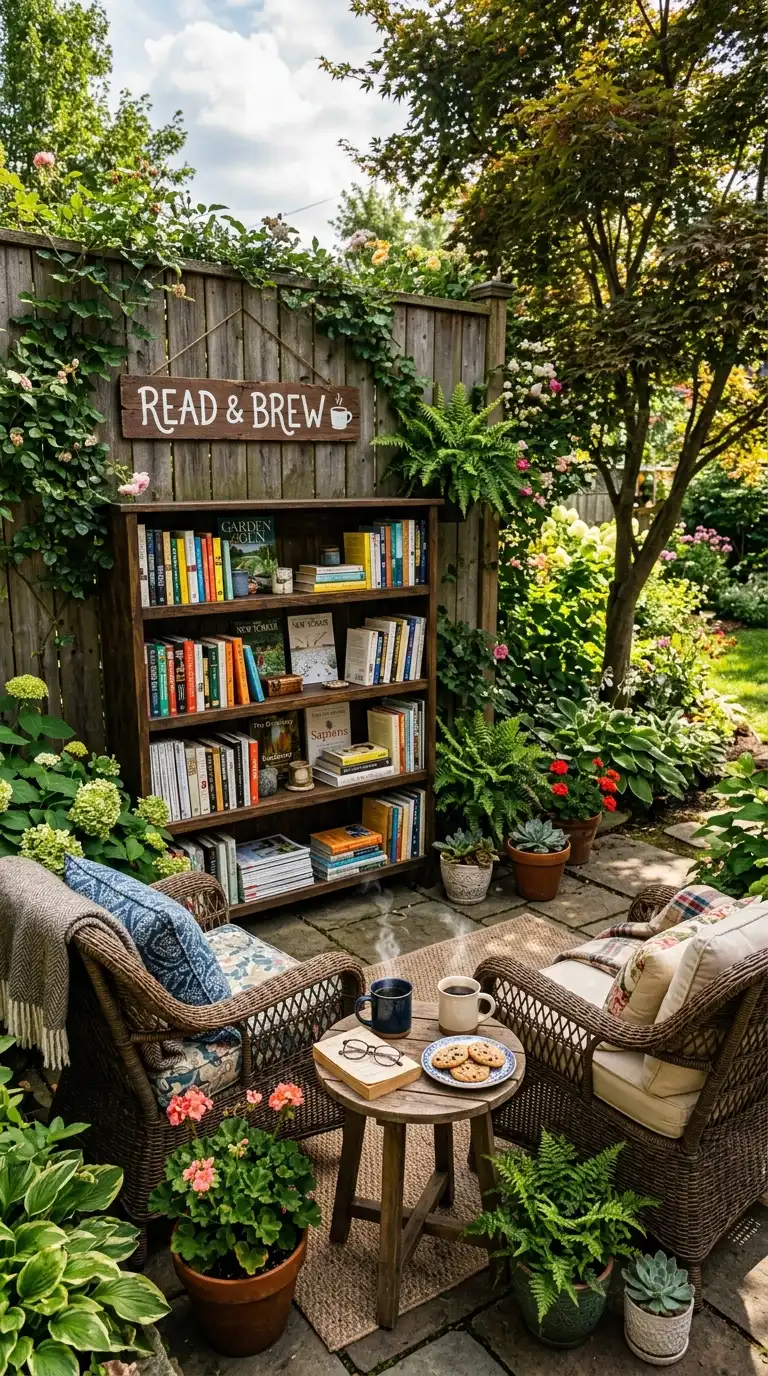 Combine a small library with a coffee nook. Place a weatherproof bookshelf against a fence or wall, filled with books, magazines, and games. Add two comfortable armchairs and a small side table. Serve coffee, tea, and cookies. This cafe is perfect for rainy afternoons or lazy weekends.