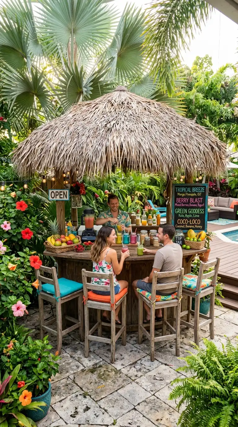 Create a vibrant, tropical smoothie bar with a thatched umbrella, bright cushions, and a blender station. Serve smoothies, fresh juices, and coconut water. Use colorful glassware, paper straws, and fresh fruit garnishes. Add a small sign with smoothie names like “Mango Magic” and “Pineapple Paradise.”
