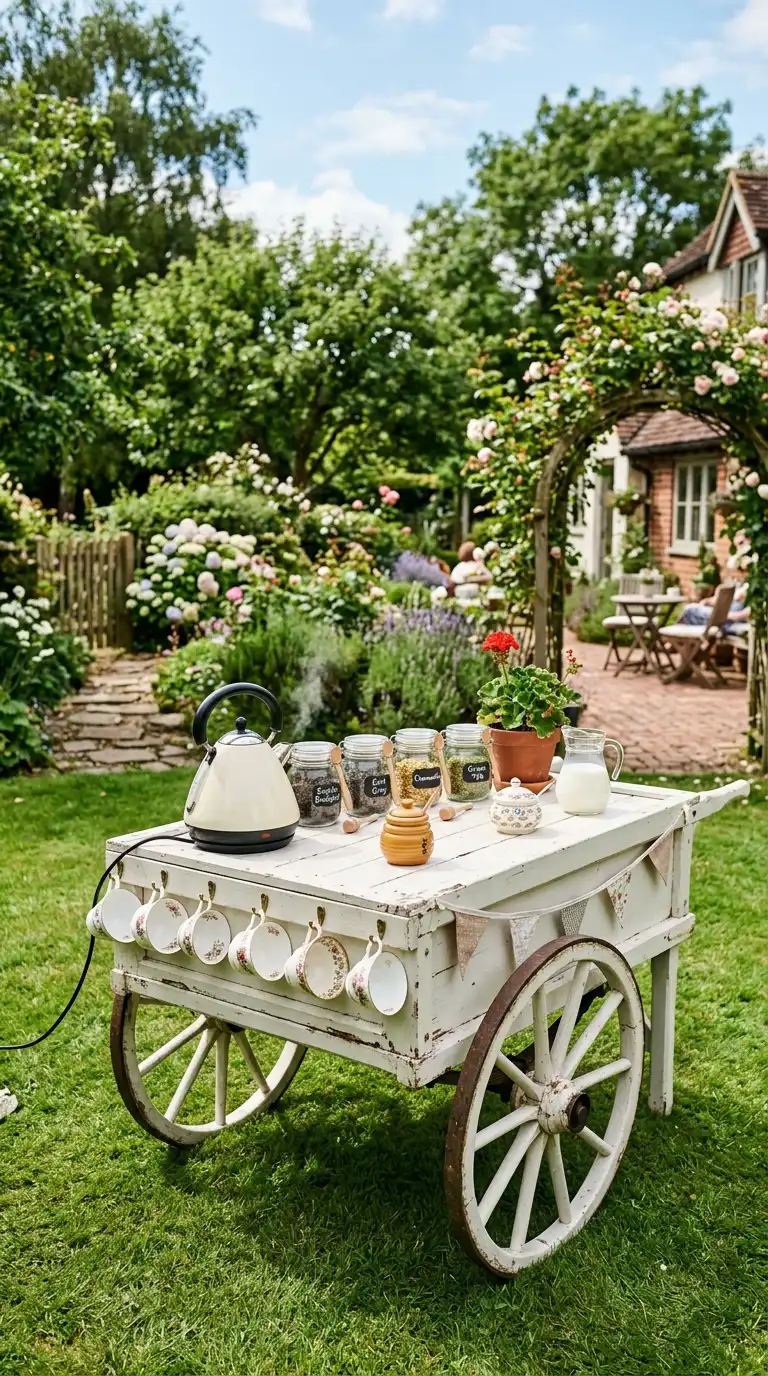Repurpose a vintage wagon or cart as a mobile tea station. Stock it with an electric kettle, an assortment of tea bags and loose-leaf teas, honey, sugar, and a small pitcher of milk. Add vintage teacups and saucers. Use the wagon for afternoon tea service, and move it wherever guests gather.