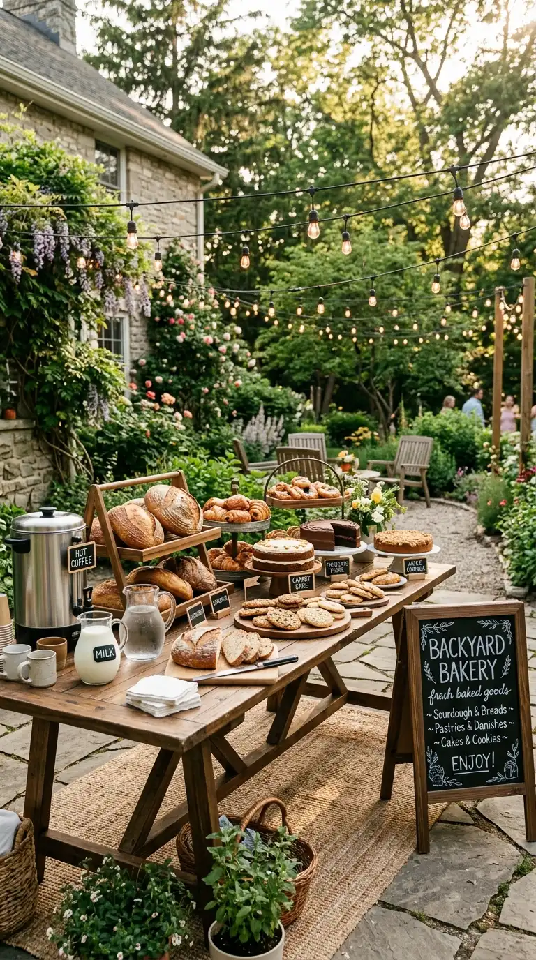 Set up a bakery display on a long wooden table. Arrange fresh bread, pastries, cakes, and cookies on tiered stands and wooden boards. Add a coffee urn and a pitcher of milk. Use a chalkboard sign to list baked goods. This cafe is perfect for weekend brunch or special celebrations.