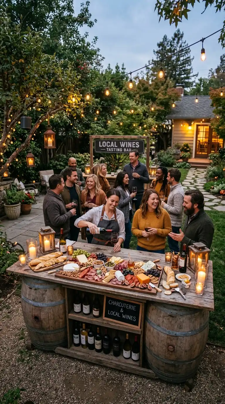 Transform your backyard cafe into an evening wine bar. Use a wooden barrel or a long table as a bar. Serve local wines, a charcuterie board with cheeses, cured meats, olives, and bread. Add candles, lanterns, and soft music. This cafe is perfect for date night or small gatherings.