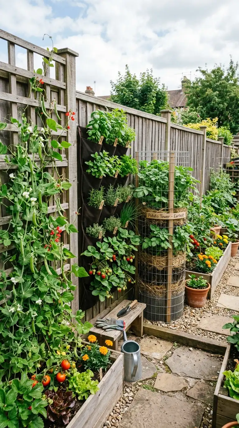 Vertical gardening maximizes growing space in compact yards. Use trellises for climbing vegetables like peas, beans, and cucumbers. Install pocket planters on fences for herbs and strawberries. Build a tower from wire mesh to grow potatoes or sweet potatoes. Vertical gardens increase yield per square foot and add visual interest to blank walls and fences.
