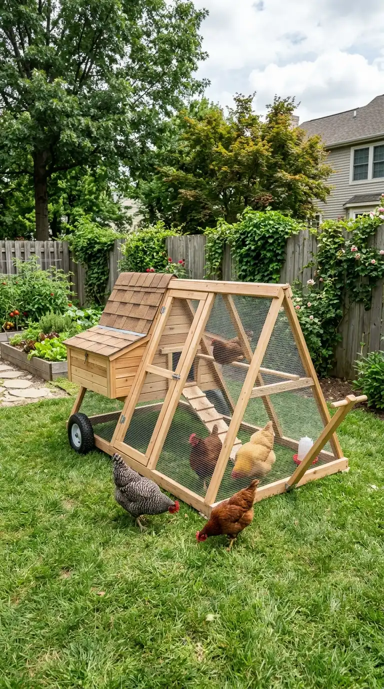 A chicken tractor is a portable coop that allows chickens to forage on fresh grass while fertilizing the soil. Move the tractor daily to give chickens access to new ground. Chickens eat insects, weed seeds, and kitchen scraps, and they provide fresh eggs. A small flock of 3-6 hens is manageable for most backyards.