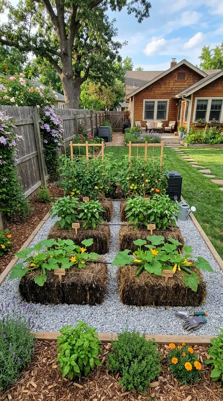 Straw bale gardening is an inexpensive, no-dig method for growing vegetables. Condition straw bales with nitrogen fertilizer and water for 10-14 days, then plant seedlings directly into the bales. Straw bales retain moisture, suppress weeds, and decompose into compost by the end of the season. This method is ideal for poor soil or temporary gardens.