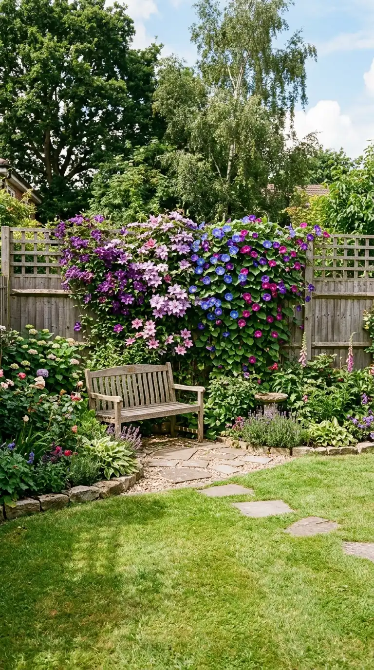 A living wall is a vertical garden planted with climbing or trailing plants. Install a trellis, wire system, or modular panels against a fence or wall, and plant ivy, jasmine, clematis, or climbing roses. A living wall adds lush greenery, softens hard surfaces, and provides privacy as the plants fill in. It is an excellent solution for small yards or for adding privacy on a deck or patio.