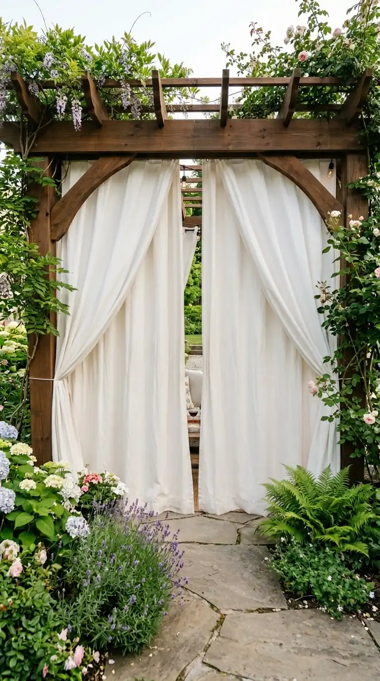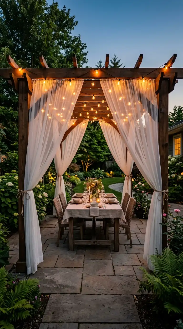 A pergola with draped fabric creates a private, intimate space within your backyard. Hang weather-resistant curtains or fabric panels from the beams of your pergola. The fabric can be drawn for complete privacy or tied back to open up the space. Add string lights or lanterns for evening ambiance. A draped pergola is perfect for dining areas, hot tubs, or lounge spaces.