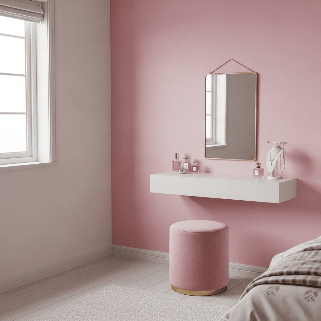Bedroom ideas for small rooms women often utilize a wall-mounted floating shelf instead of a bulky desk. Paired with a slender stool and a backlit mirror, this creates a dedicated beauty zone that takes up zero floor space.