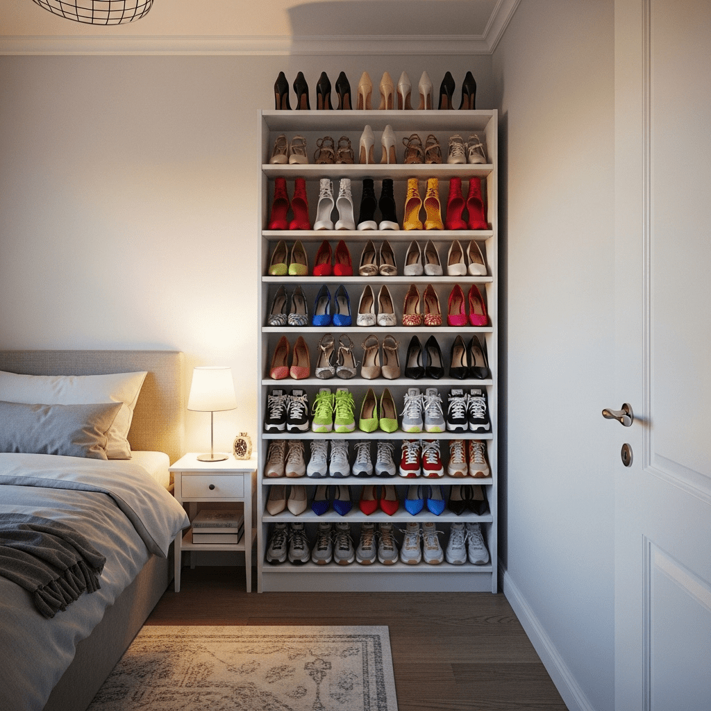 Bedroom ideas for small rooms women utilize slim, vertical shelving units to display favorite footwear. This turns an accessory collection into a piece of “living art,” clearing out closet floor space while adding a boutique feel to the room.