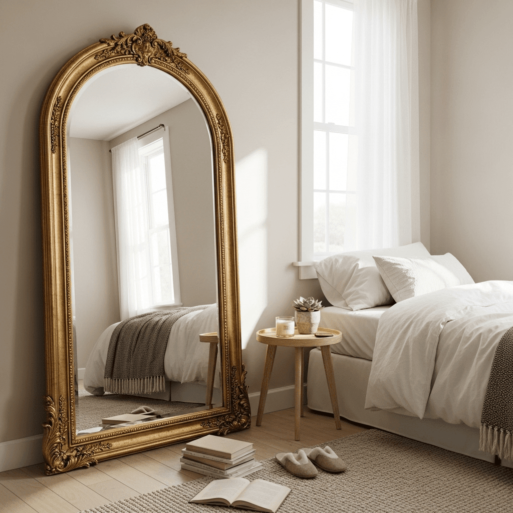 Bedroom ideas for small rooms women use large-scale mirrors to create the illusion of an endless room. A floor-to-ceiling lean-to mirror is perfect for outfit checks and effectively doubles the visual depth of the sleeping area.