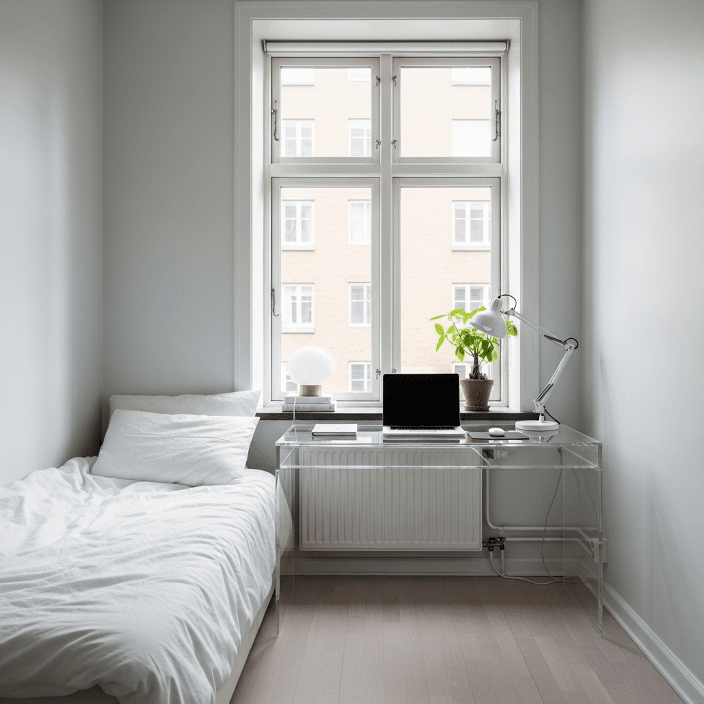 Bedroom ideas for small rooms women incorporate transparent acrylic furniture to provide a workspace without visual clutter. Because the desk is “clear,” the eye sees straight through it to the floor, maintaining an open atmosphere.