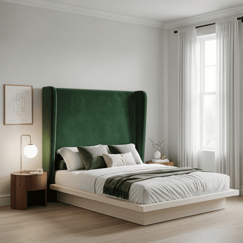 Bedroom ideas for small rooms women use a plush, velvet wingback headboard to add architectural weight. The tall, soft sides create a “cocoon” effect, making the bed feel like a private, luxurious island in a small room.