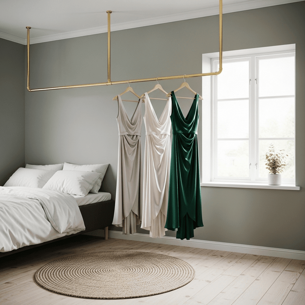 Bedroom ideas for small rooms women swap a heavy armoire for a minimalist white or gold hanging rail. Displaying a curated selection of aesthetically pleasing dresses adds color and texture to the room’s decor.