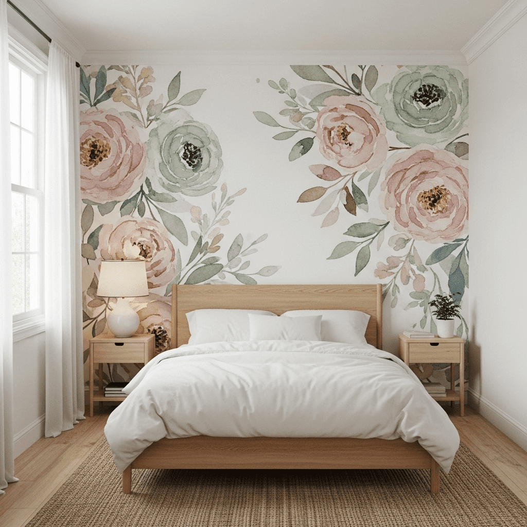 Bedroom ideas for small rooms women use large-scale floral peel-and-stick wallpaper on a single accent wall. The organic shapes of the flowers break up the rigid lines of the small room, adding a dreamy, garden-like depth.