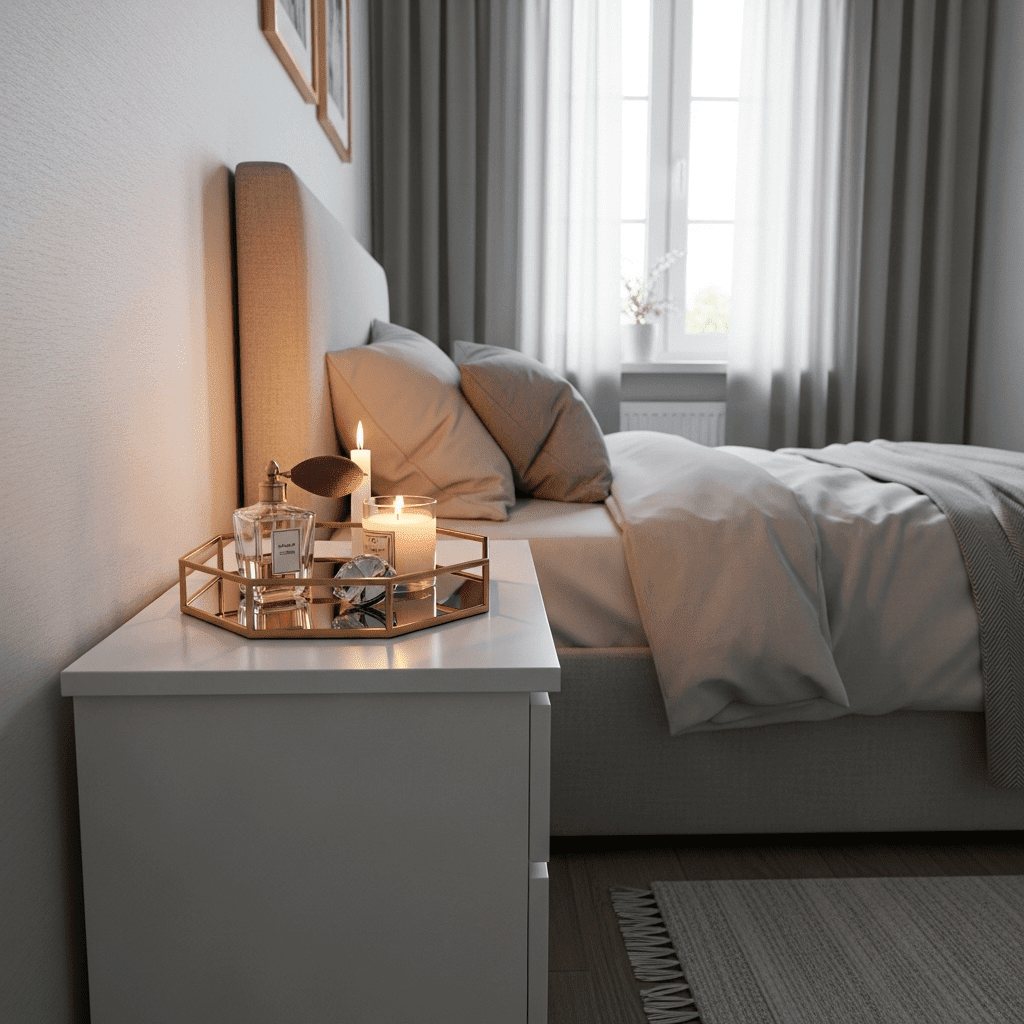 Bedroom ideas for small rooms women organize small items like perfumes and candles on mirrored trays. This “groups” the items together, making a collection of small objects look like a single, intentional design choice rather than a mess.