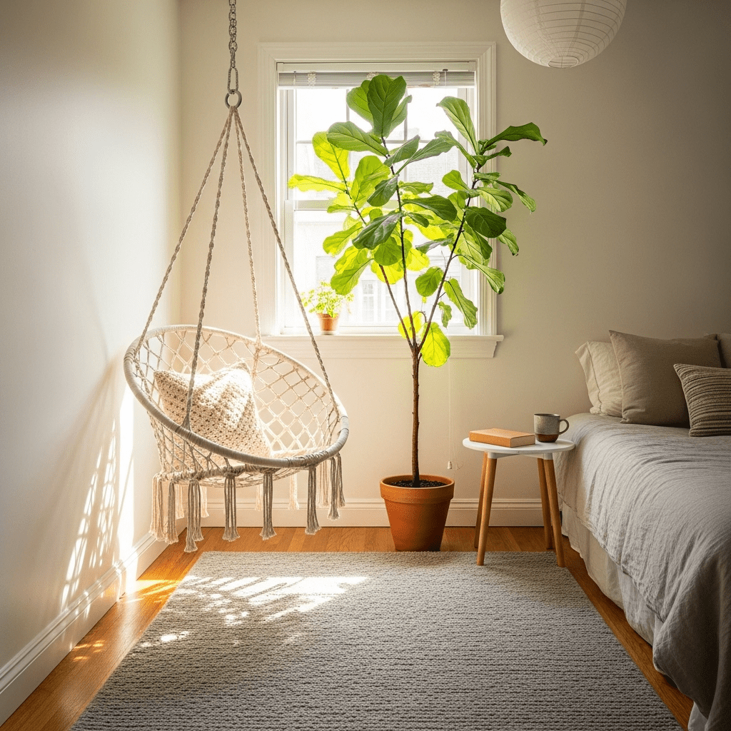 Bedroom ideas for small rooms women can replace a chair with a hanging macramé swing chair. Because it’s suspended from the ceiling, it leaves the floor clear and adds a playful, bohemian aesthetic to the corner.