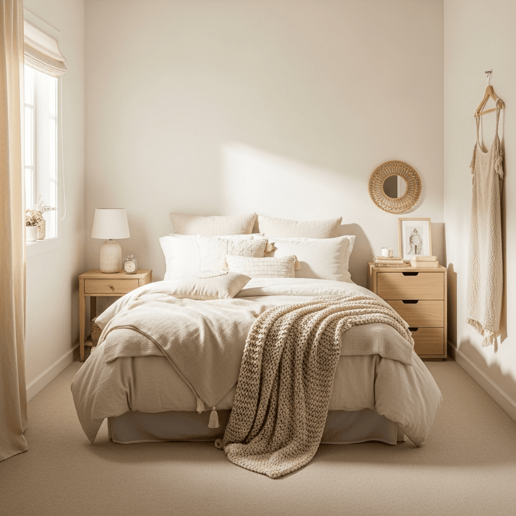 Bedroom ideas for small rooms women utilize various shades of ivory, cream, and beige to create a seamless environment. This monochromatic approach is incredibly soothing and prevents the room from feeling “busy.”