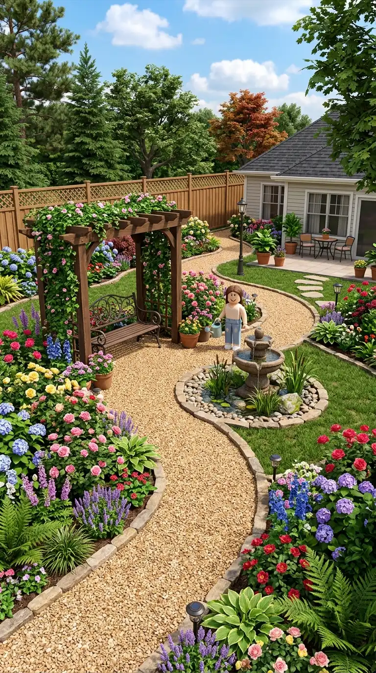 Design a backyard that feels like a secret garden. Use winding gravel pathways bordered by flower beds filled with colorful blooms like roses, hydrangeas, and lavender. Add a wooden pergola draped with climbing vines, and place a wrought iron bench beneath it. Include a small pond or fountain for soothing sound, and add plenty of trees and shrubs for privacy and shade.