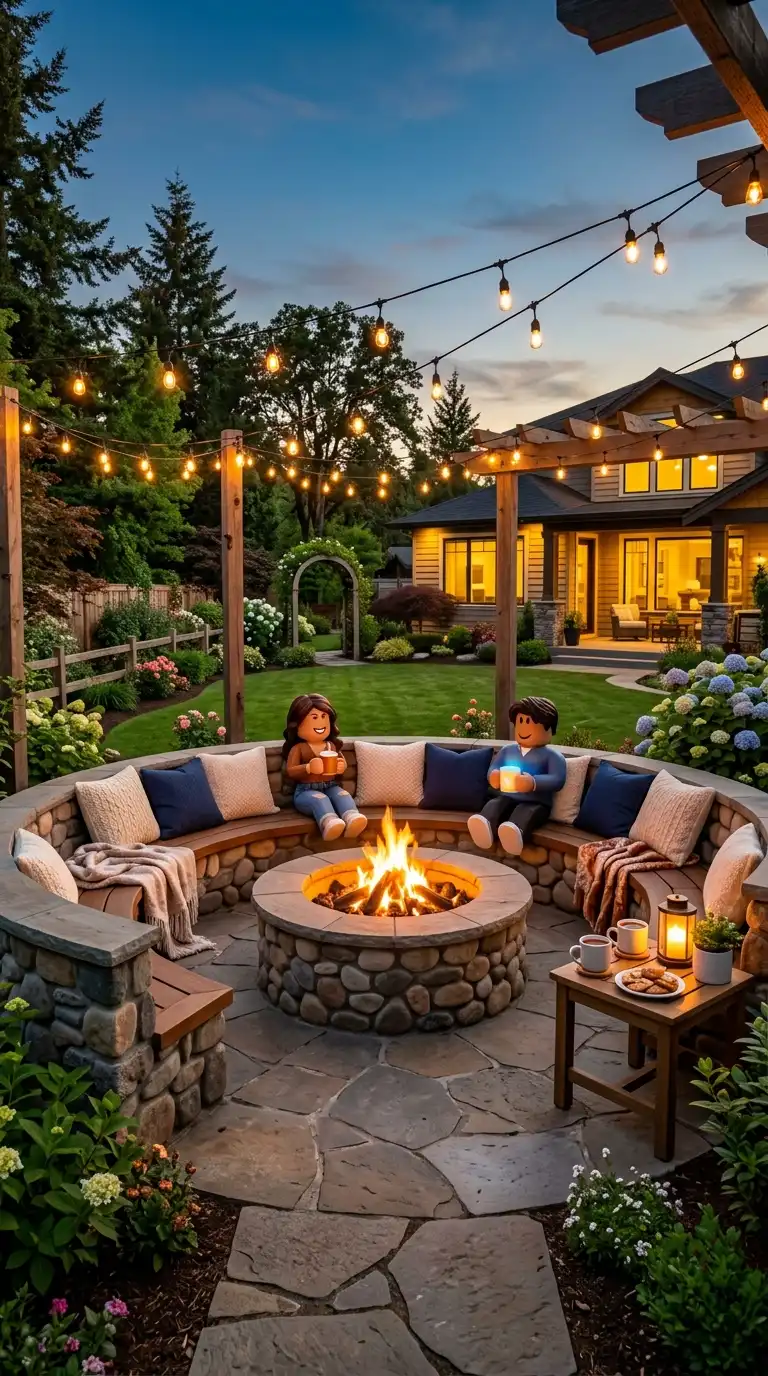 Create an intimate gathering space with a fire pit as the focal point. Use stone or brick to build a circular fire pit, and surround it with comfortable outdoor sofas, armchairs, or built-in benches. Add string lights overhead for ambiance, and use outdoor rugs and pillows to define the space.
