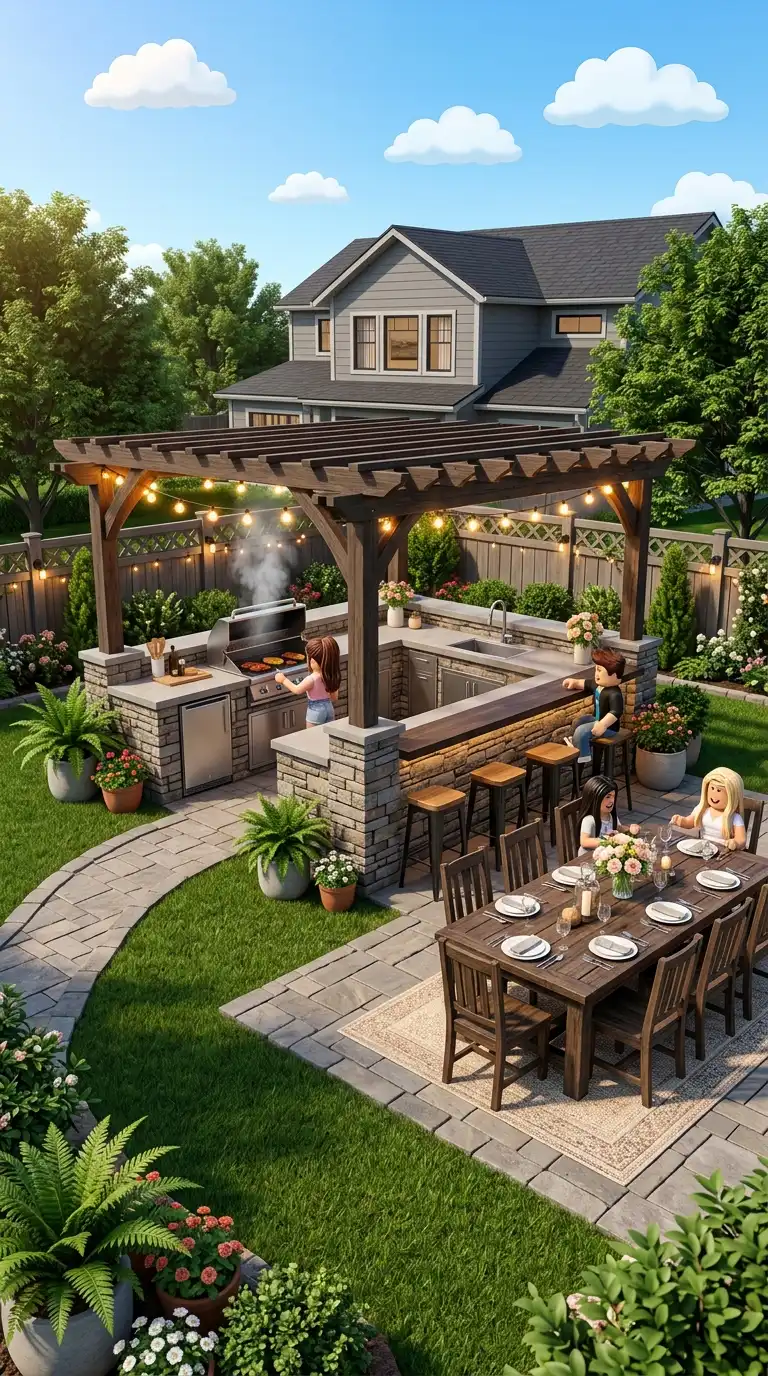 Design a backyard perfect for entertaining with a fully equipped outdoor kitchen and dining area. Include a built-in grill, counter space, a sink, and a refrigerator. Add a bar with stools for casual dining, and position a large dining table nearby. Use stone or brick for the kitchen structure, and add a pergola for shade.