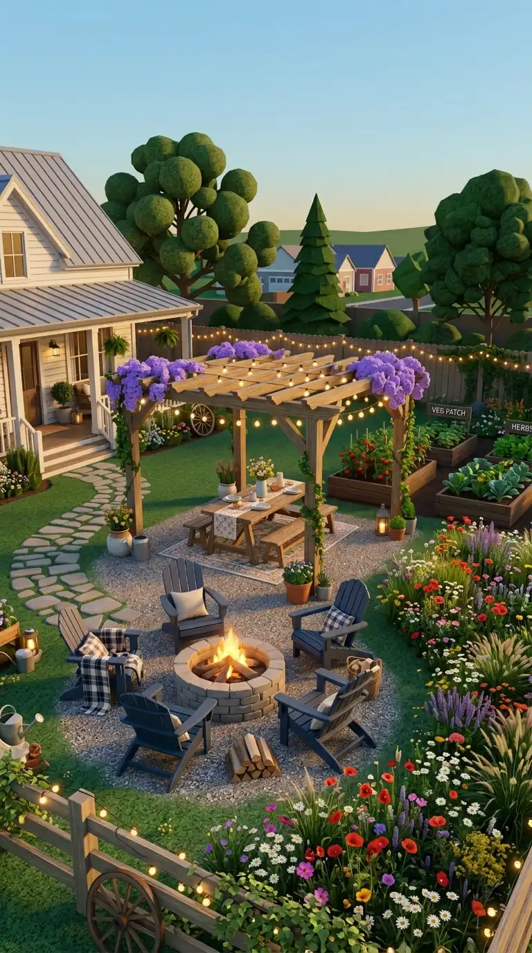 Embrace rustic charm with a farmhouse-inspired backyard. Use reclaimed wood for a pergola, raised garden beds, and a picnic table. Add a gravel patio, a fire pit with Adirondack chairs, and a vegetable garden. Incorporate vintage elements like a galvanized tub, antique tools, and string lights. Plant flowers like sunflowers, lavender, and wildflowers.
