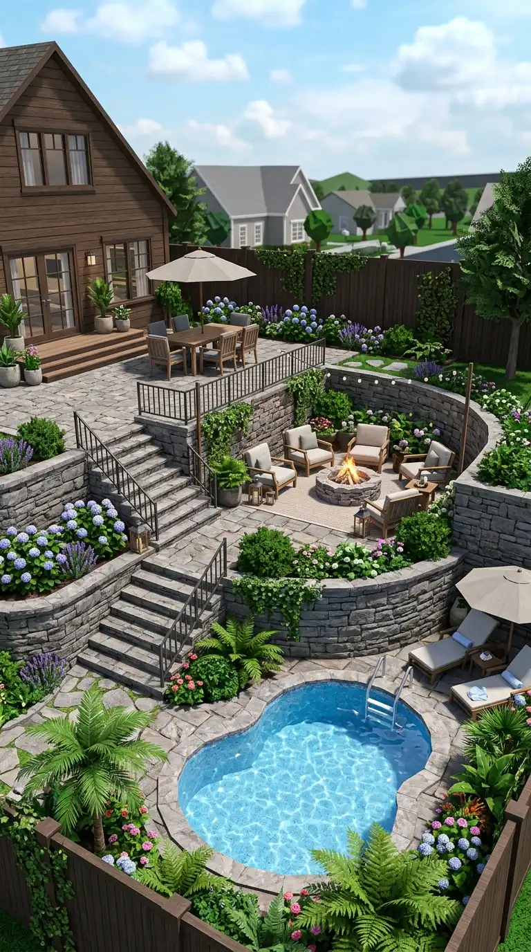 For sloped lots, create visual interest with a multi-level terrace design. Use stone or wood retaining walls to create distinct levels. Designate one level for dining, another for lounging, and a third for a pool or garden. Connect the levels with stairs or gentle ramps.