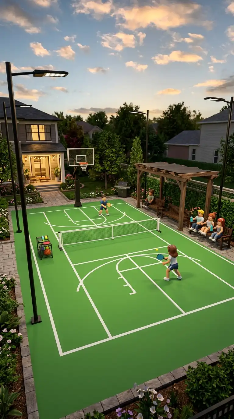 Design a backyard for active recreation with a multi-purpose sports court. Use a flat surface lined for basketball, tennis, or pickleball. Add a hoop, net, and lighting for evening play. Include a seating area for spectators, and add a small shaded area for rest.