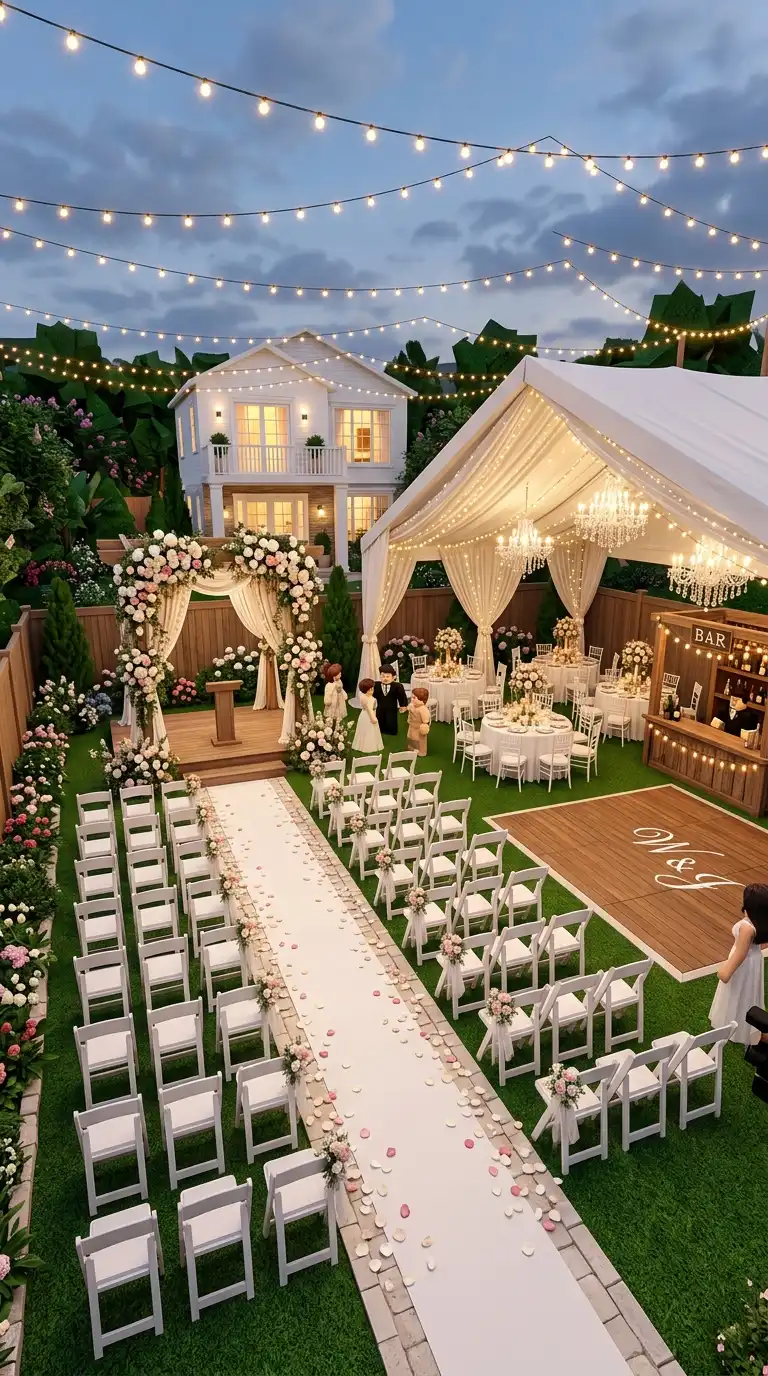 Design a backyard that can host elegant weddings or special events. Use a floral arch for ceremonies, long rows of white chairs, and a tent with chandeliers for receptions. Add a dance floor, a bar, and a photo booth. Use string lights, lanterns, and floral centerpieces to create a romantic atmosphere.