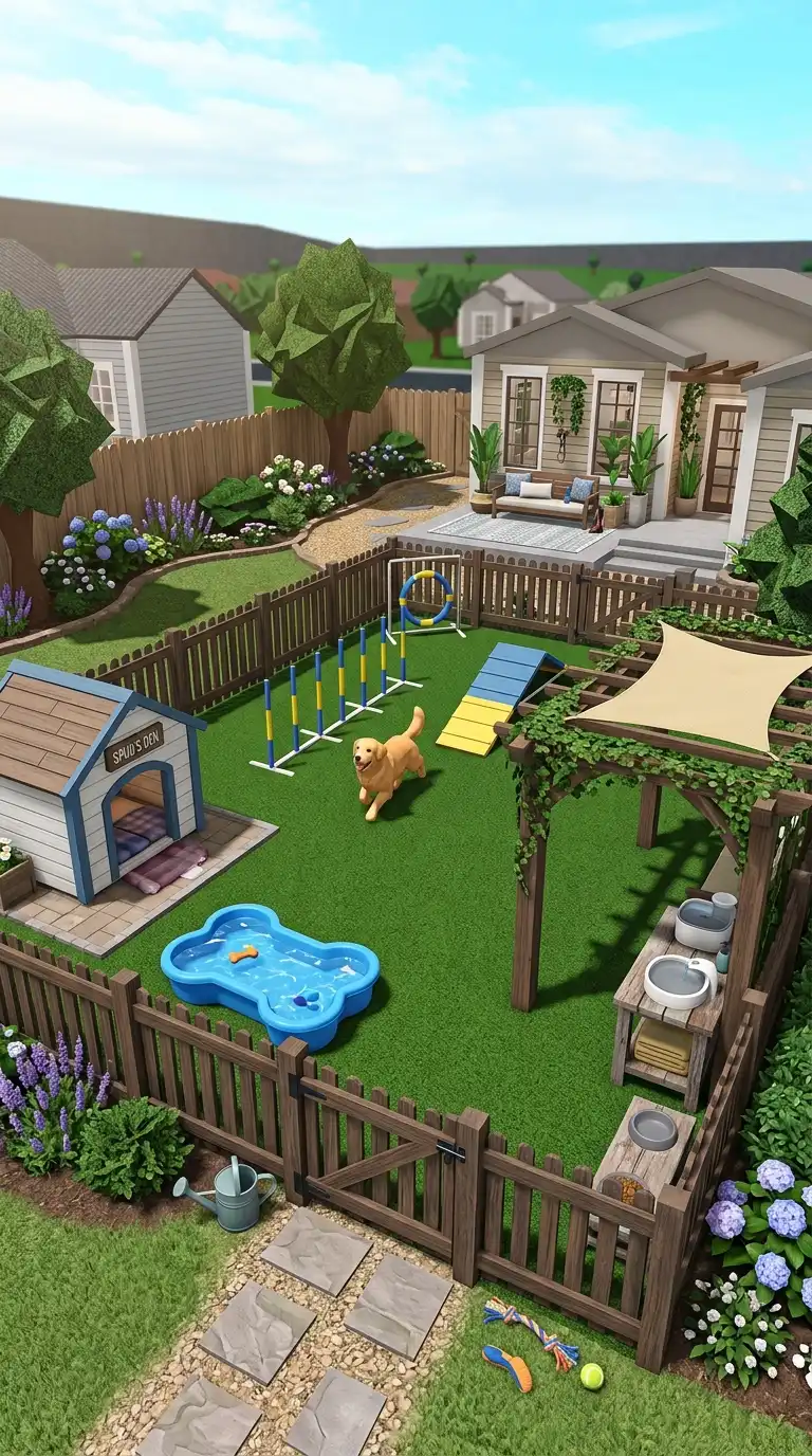 If your Bloxburg family includes pets, design a dedicated area for them. Use a fenced run with artificial turf or pea gravel for easy cleaning. Add a doghouse, agility equipment, a splash pool, and plenty of toys. Include a shaded area and a water station.