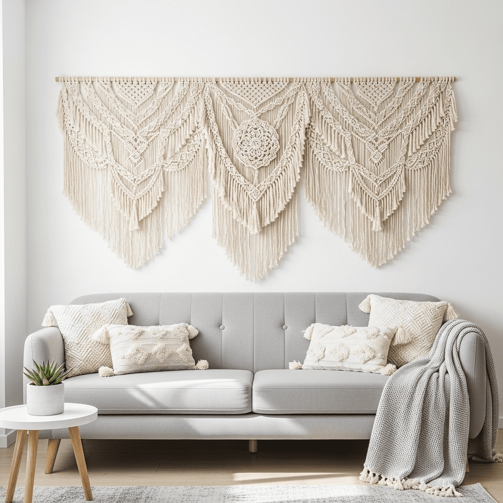 Using large-scale hand-woven wall hangings as the primary art. The texture of the ropes adds a soft, tactile element that absorbs sound and adds warmth to the walls.
