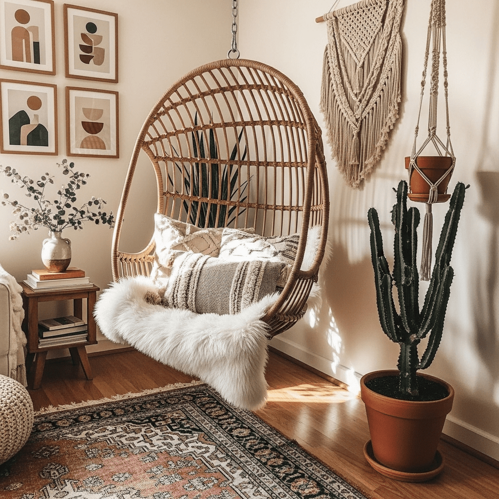 Replacing a traditional armchair with a suspended rattan egg chair filled with sheepskin throws and velvet pillows. It adds a playful, weightless element to the room.