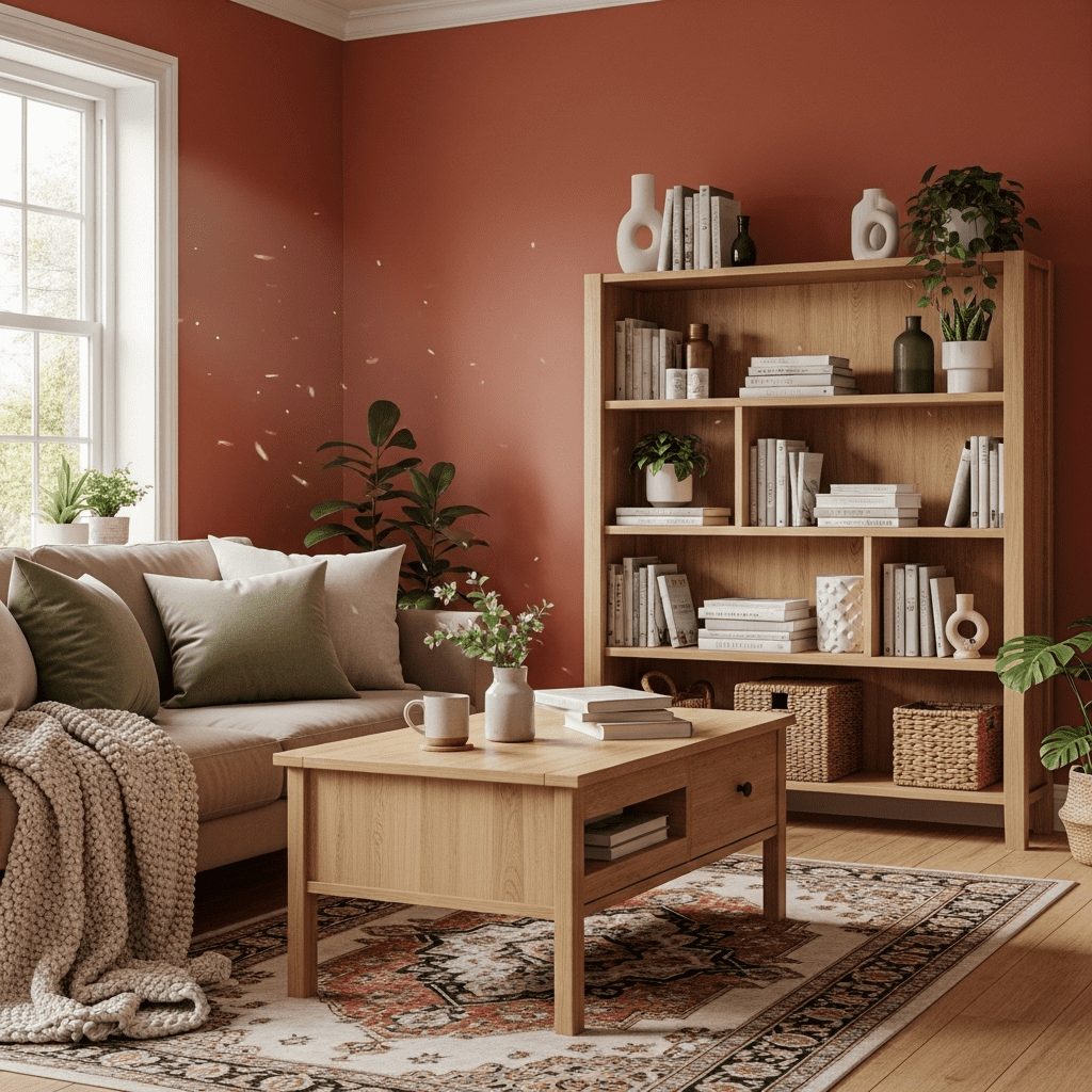 Focusing on furniture with “perfectly imperfect” finishes—raw-edge wood coffee tables, distressed paint, and visible wood grains.