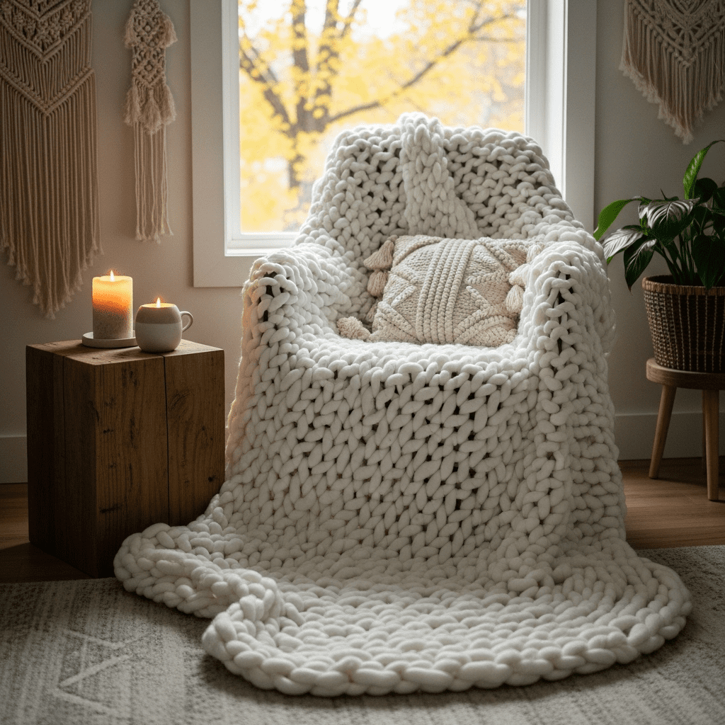 Layering chunky, hand-knit “giant yarn” blankets over the backs of chairs and sofas to add a sense of “Hygge” to the Bohemian aesthetic.