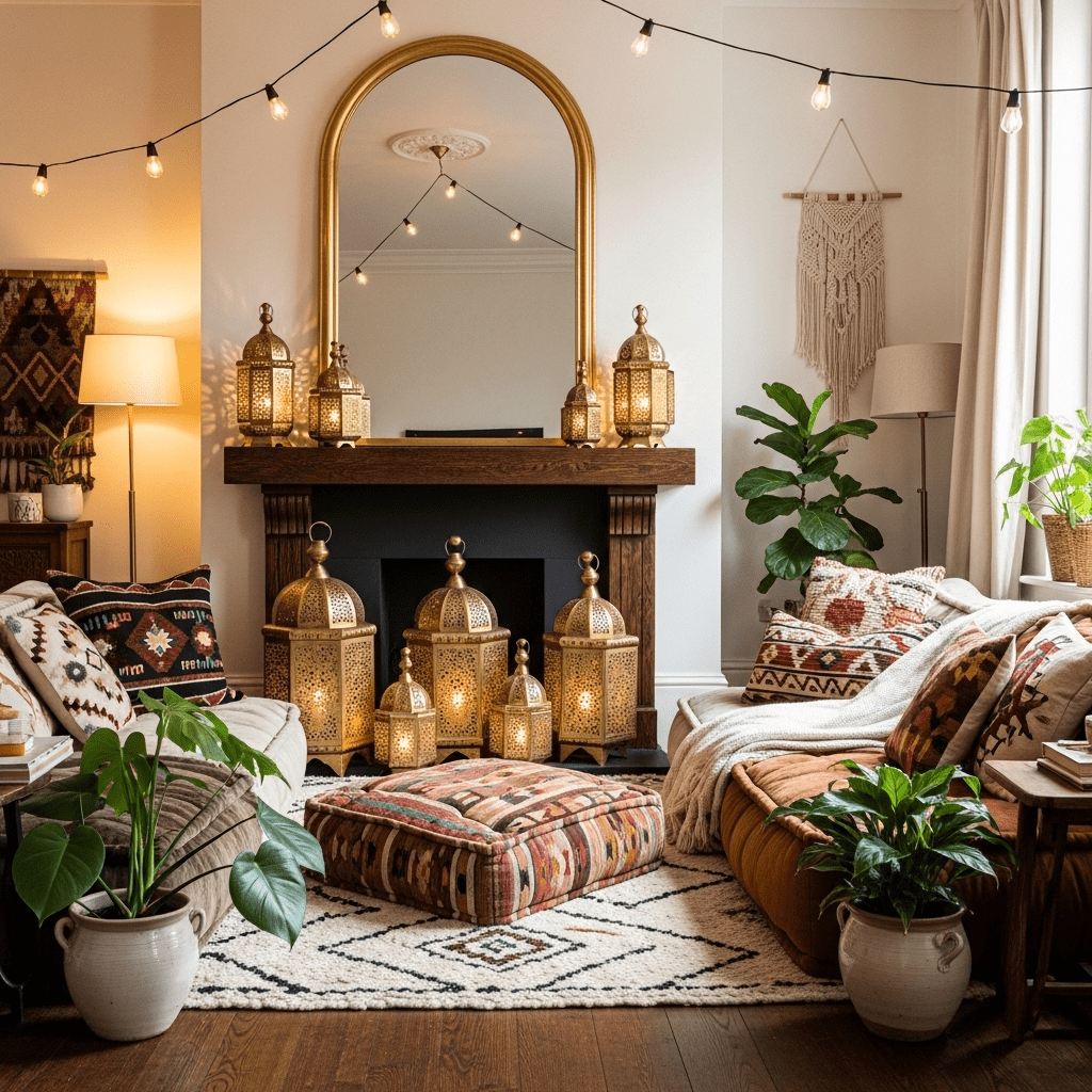 Adding a touch of “Boho-Luxe” with vintage brass trays, gold-framed mirrors, and metallic lanterns that reflect warm evening light.