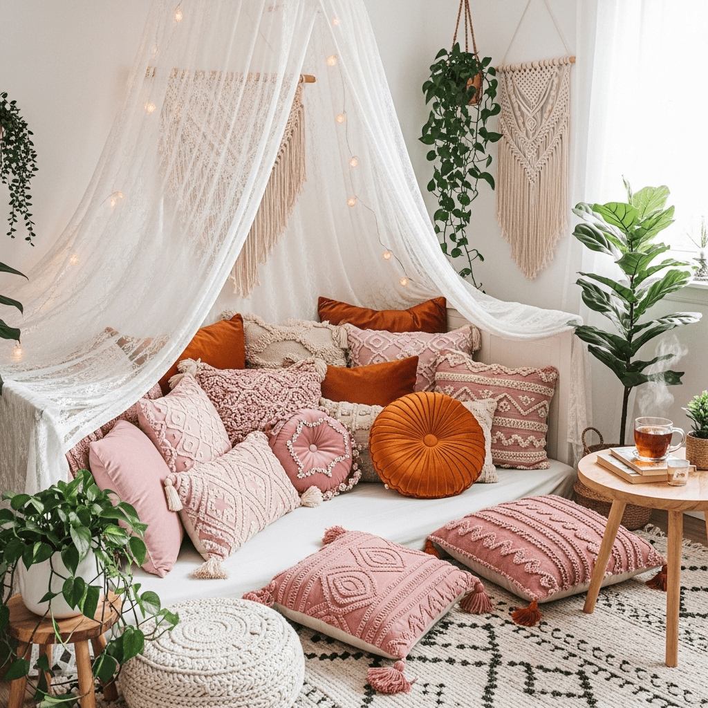 Transforming a corner into a private nook by hanging sheer white curtains or a lace canopy over a daybed or a pile of floor cushions.