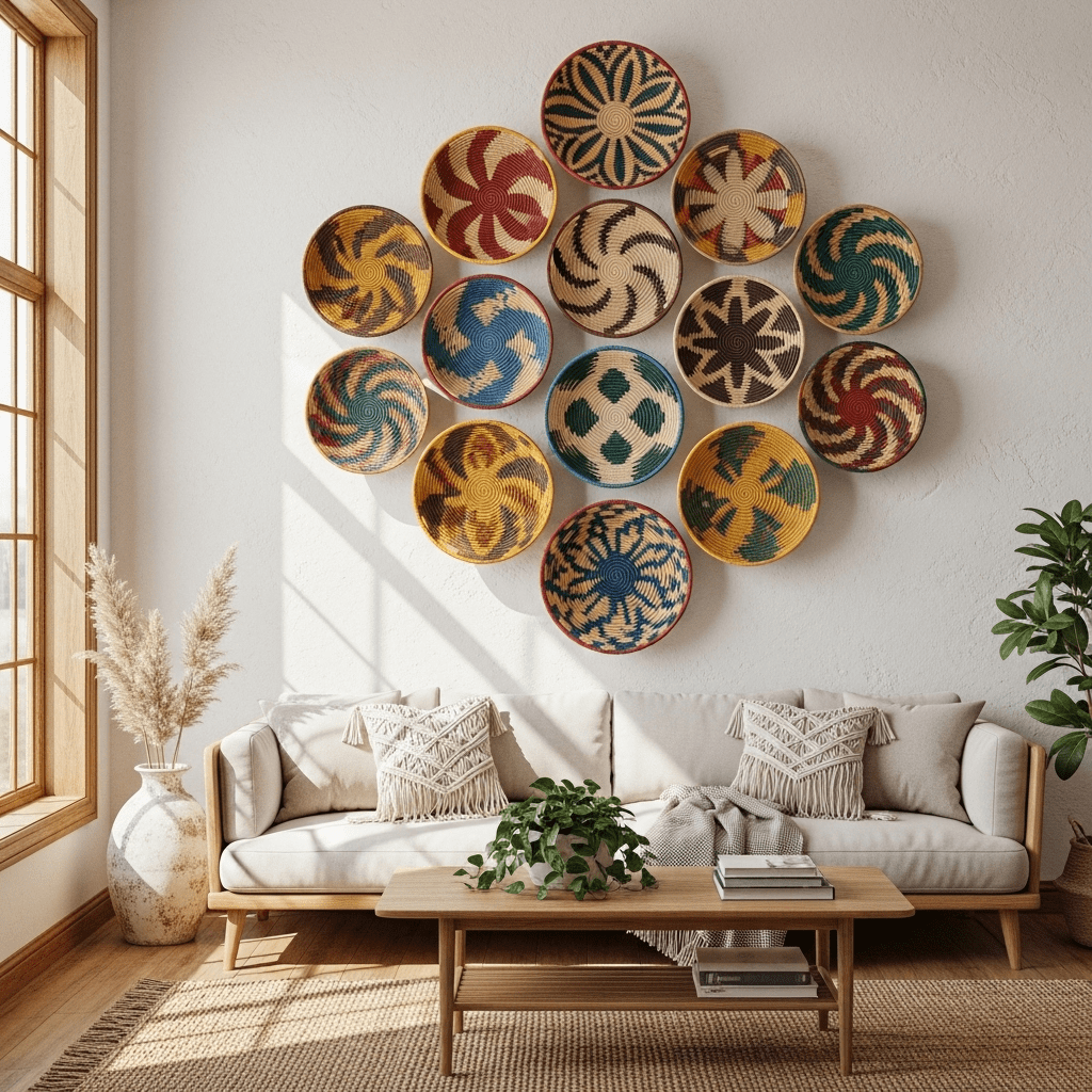 A popular Boho trend where various sizes and colors of woven African or seagrass baskets are arranged in a cluster on the wall.